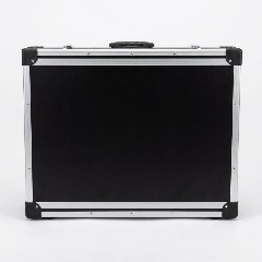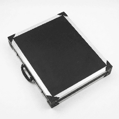 The finished conductive PP corrugated case: aluminum edge banding, anti-static corner protectors, metal locks and handle.